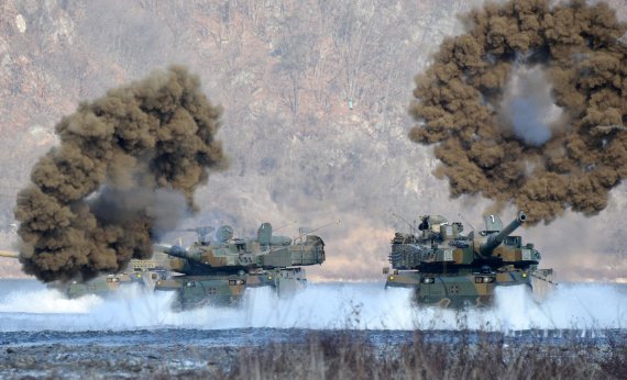 육군의 핵심 기계화 전력인 K2 흑표전차가 21일 공병의 지원 없이 자체 잠수도하 능력으로 남한강의 물살을 갈랐다.