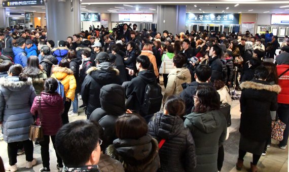 22일 오전 서울 올림픽로 롯데백화점 잠실점 에비뉴엘 지하 1층 평창 팝업스토어 앞에 평창올림픽 기념 롱패딩을 사기 위해 전날부터 기다린 시민들이 줄지어 있다./사진=서동일 기자