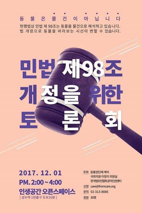 동물권단체 케어는 정의당 이정미 의원실, 한국법조인협회 공익인권센터와 함께 12월 1일 오후2시 서울 성수동 인생공간 오픈스페이스에서 '민법 제98조 개정을 위한 토론회'를 개최한다고 30일 밝혔다.