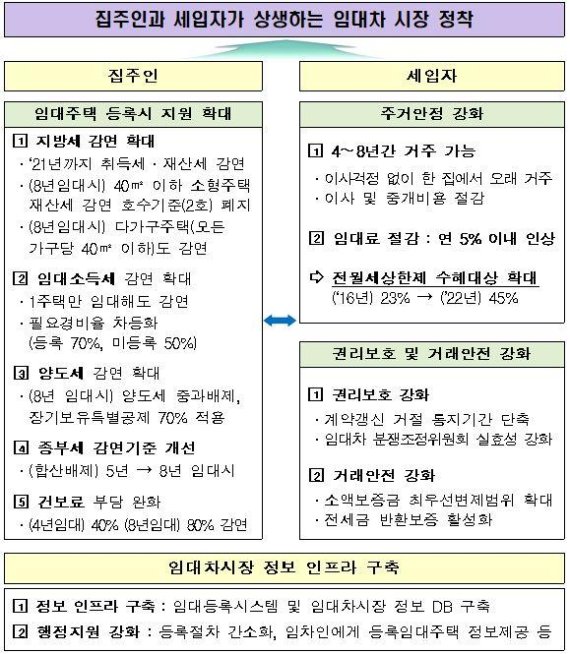 정부는 다주택자의 주택임대사업자 등록 확대를 위해 등록시 발생하는 각종 세금과 건강보험료를 최대한 깎아주기로 했다. 그러나 장기임대주택 등록을 유도하기 위해 8년 이상 장기임대사업자 위주로 지원을 강화했다.