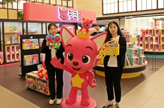 부산 해운대 우동의 신세계 센텀시티는 백화점 지하 2층에서 내년 1월 4일까지 유투브와 구글플레이 선정 우수 콘텐츠로 아이들에게 인기를 끌고 있는 '핑크퐁' 팝업스토어를 진행한다고 19일 밝혔다. 이번 팝업스토어에서는 사운드인형, 한글버스, 사운드북 등 핑크퐁의 다양한 제품을 한자리에서 만나볼 수 있다. 매장 직원들이 핑크퐁 제품들을 홍보하고 있다.