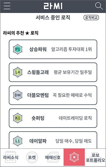 또한 라씨에서는 종목추천 시그널 서비스 외에도 '로보 포트폴리오' 서비스 제공을 통해, 종목추천 서비스 외에도 안정적인 포트폴리오를 이용하고자 하는 사용자들도 만족시키고 있다.