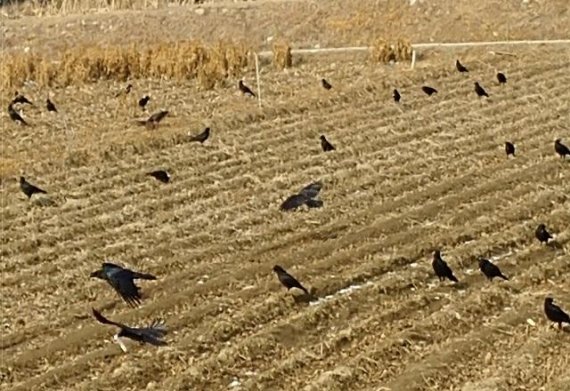 이상기온 한파에 겨울 곡식 찾아나선 까마귀떼들.
