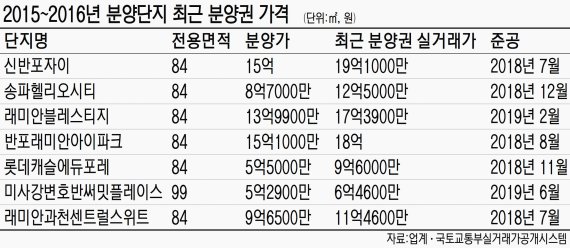 2015년 11월 분양한 반포동 반포래미안아이파크(2018년 8월 준공) 84㎡도 분양가 15억1000만원에서 지난 11월 18억원에 거래돼 2억9000만원이 올랐다.