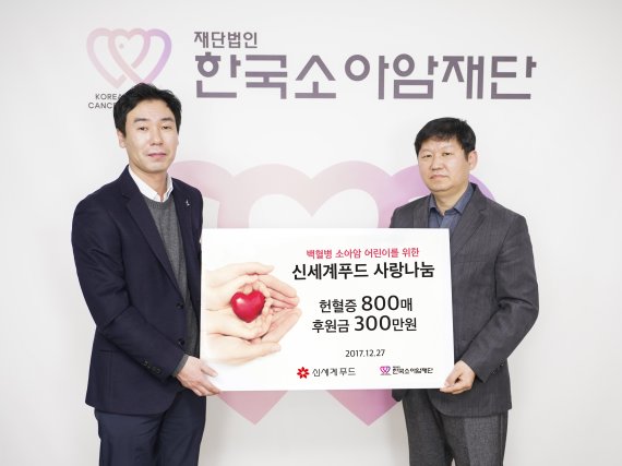 신세계푸드는 한국소아암재단에 임직원들이 자발적으로 모은 헌혈증 800장과 후원금 300만원을 전달했다. 서울 중림동 한국소아암재단에서 27일 열린 헌혈증 전달식에서 김진규 신세계푸드 CSR 팀장(왼쪽)과 홍승윤 한국소아암재단 사무국장이 기념촬영을 하고 있다.