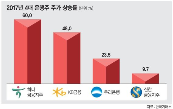 지난 한 해 동안 은행주는 대표 내수주로서 국내 증시를 견인하는데 큰 역할을 해냈다. 하나금융지주는 지난해 60.0% 주가가 상승했으며 KB금융은 48.0%, 우리은행은 23.5% 올랐다. 다만 신한지주는 9.7% 상승하며 4대 은행주들 중에서는 상승폭이 유일하게 한자리수에 머물렀다.