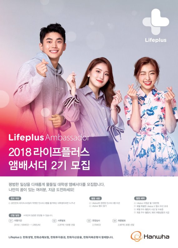 한화생명은 한화 금융계열사 공동 브랜드인 'Lifeplus(라이프플러스)' 대학생 홍보대사 '라이프플러스 앰배서더(Lifeplus Ambassador) 2기' 를 모집한다고 10일 밝혔다.