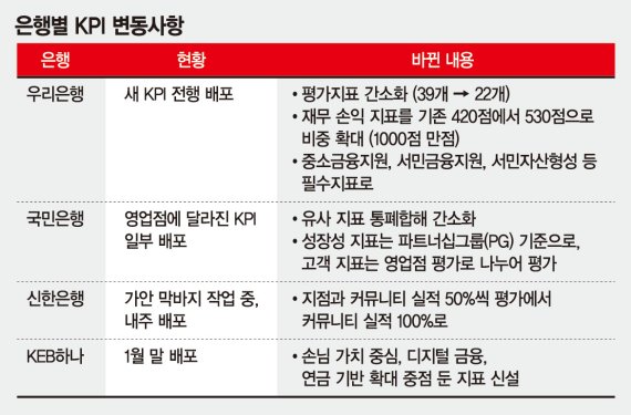 현재 새 KPI가 확정돼 나온 곳은 우리은행이고, 국민은행은 달라진 KPI에 대한 일부 내용이 영업점에 안내된 상태다. 신한은행 역시 가안이 나와 막바지 마무리 작업 중이며, KEB하나은행은 1월말경 변경된 KPI를 발표할 예정이다.