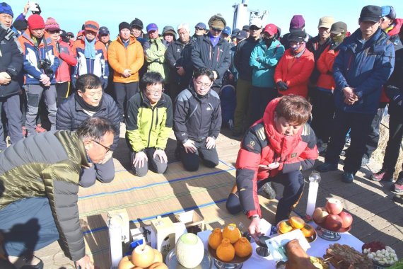 [제주=좌승훈기자] 민족 화합과 산악인의 무사안녕을 기원하는 제45회 한라산 만설제(滿雪祭)가 21일 오전 11시 30분 한라산국립공원 어승생악에서 개최됐다.