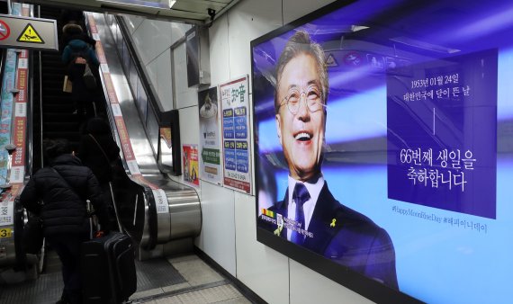 아울러 앞서 지난 11일부터는 서울 광화문역을 비롯해 10개 지하철 역사에 문 대통령의 생일을 축하하는 광고가 걸렸다. 광고판에 문 대통령 얼굴과 함께 '대한민국에 달이 뜬 날'이라는 문구가 실렸다. 광고는 지지자들의 자발적 모금으로 이뤄졌다.
