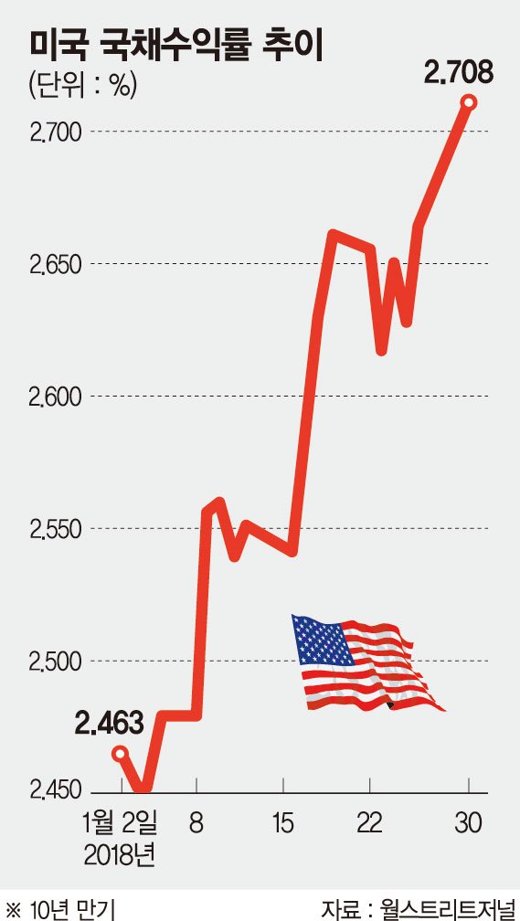 29일(현지시간) 파이낸셜타임스(FT)에 따르면 전세계 채권시장 매각세가 확대되면서 전문가들 사이에 이같은 우려가 커지는 것으로 분석됐다. 이날 10년만기 미 국채 수익률은 지난주말보다 0.05%포인트 상승한 2.73%까지 올라 2014년 4월 이후 최고치를 기록했다.