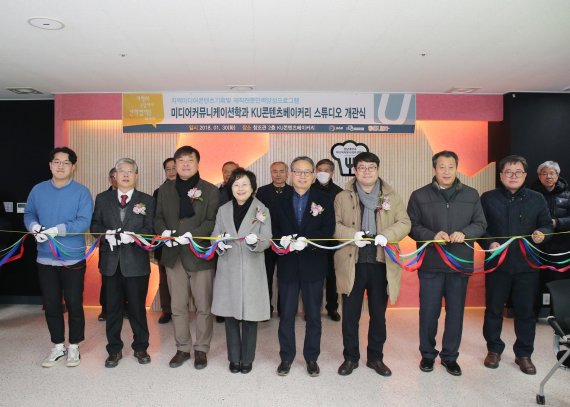 이날 문을 연 KU 콘텐츠베이커리 스튜디오는 2017학년도 링크플러스 사회맞춤형 교육모듈에 선정돼 추진한 사업 중 하나로, 이동식 벽채 및 슬라이드 세트를 활용해 7개의 테마별 스튜디오로 이용할 수 있다.