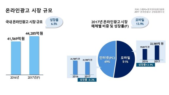 한편 이번 '2017 온라인광고 산업동향 조사'는 온라인광고 사업체(400개)와 온라인 광고를 집행한 광고주(200개)를 대상으로 대면조사 방식으로 진행됐다. 또 이용자 인식 조사는 PC 및 모바일 인터넷 이용자 2000명을 대상으로 온라인을 통해 진행됐다.