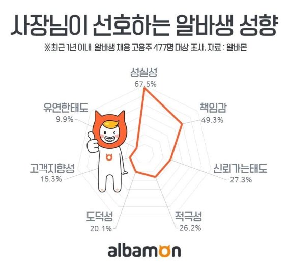 알바 직원을 채용하는 고용주들은 알바 직원 뽑을 때 ‘성실성’을 가장 높이 본다고 답했다.