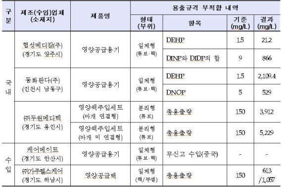 식약처는 또한 케어메이트가 식품용 기구로 정식 수입신고하지 않고 판매한 영양공급용기 제품과 ㈜가주헬스케어와 ㈜두원메디텍이 각각 판매한 영양공급백과 영양액주입세트 제품은 총용출량 규격이 초과돼 판매금지 및 회수조치 했다.