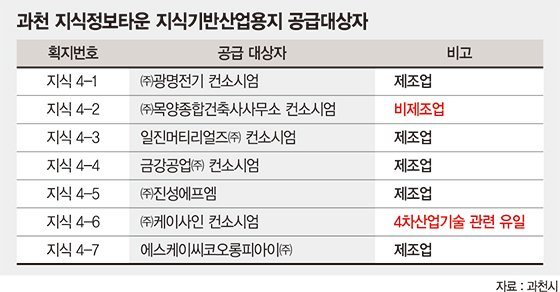 '지식기반산업용지'라는 말이 무색할 정도로 제조업을 기반으로 하는 기업들이 해당 부지의 공급대상자로 선정된 탓이다. 특히 과천지식정보타운 공급가는 주변시세의 절반에도 못 미쳐 중소.중견기업의 성장판으로 사용돼야 할 지식정보타운이 제조업체들의 땅 투기 대상이 됐다는 지적까지 나온다.
