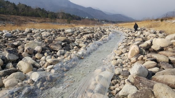 강원 고성군은 최근 속초시 겨울가뭄 농업용수 지원관련, 속초시가 고성군에 있는 원암저수지를 보강하여 유효저수량을 증설하여 항구적 대책을 마련하겠다고 한 것에 대해, 이 문제는 고성군과 한국농어촌공사와 협의한 바 없이 일방적으로 속초시에서 발표한 내용이다 고 반박했다. 사진은 속초시 쌍천도포작업. (사진제공=속초시)