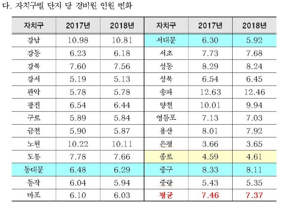아울러 경비노동자의 통상시급은 1047원(2017년 6541원→2018년 7588원) 증가했다. 서울시는 "경비원은 최저임금 수준의 시급을 받는 취약계층으로 최저임금 인상에 즉각적인 영향을 받는다는 사실을 알 수 있다"고 설명했다. 실제 경비원 월 평균 임금 상승률은 8.4%로 최저임금 인상률(16.4%)에 못 미쳤다.