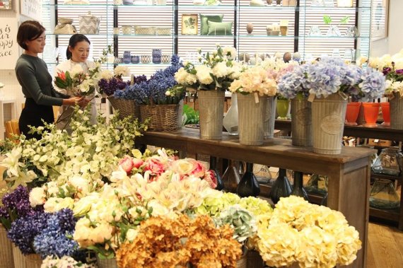 부산 해운대 우동의 신세계 센텀시티 몰 3층 '메종티시아'는 인테리어 소품으로 봄 느낌을 물씬 느낄 수 있는 조화꽃이 인기를 끌고 있다고 21일 밝혔다. 메종티시아에서는 수국, 시아신스, 몬스테라 등 100여개의 다양한 조화꽃을 선보여 집안 분위기에 맞춰 연출이 가능하다. 메종티시아 매장에서 고객이 인테리어 소품으로 사용할 조화꽃을 고르고 있다.