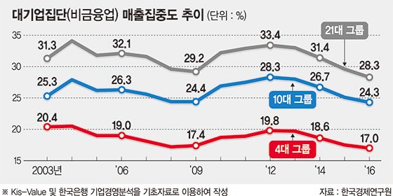 10대 그룹을 기준으로 보아도 2016년 16.4%로 기존 매출비중보다 7.9%포인트 낮고, 4대 그룹 기준으로도 2016년 기준 17.0%에서 10.2%로 6.8%포인트 낮아진다.