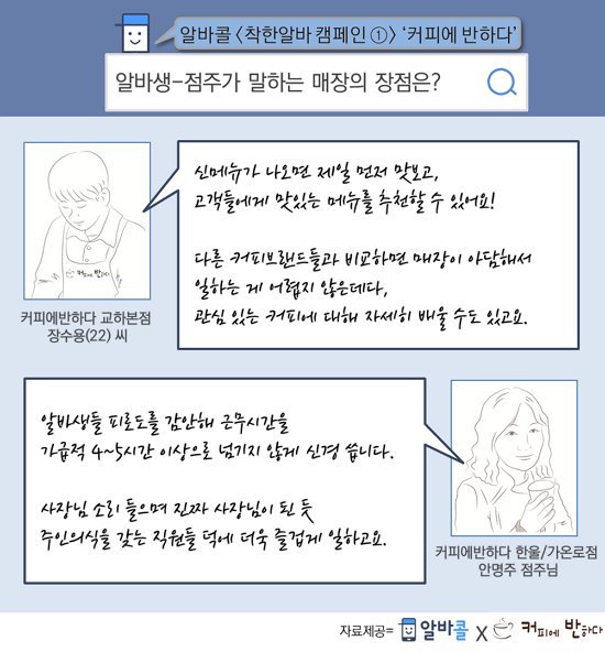 임경현 알바콜본부장은 “기존 알바 구직사이트에서 볼 수 없었던 새로운 서비스 제공의 일환으로 이번 ‘착한알바’캠페인을 기획했다”며 "커피에반하다 외에도 입점 프랜차이즈를 통한 양질의 알바 일자리 정보 제공을 이어나갈 것"이라고 말했다.