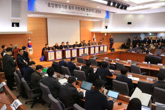 22일 서울정부청사에서 '중앙행정기관 등의 이전계획 변경안' 공청회가 개최됐다. 이날 공청회에서는 2019년 8월까지 과학기술정보통신부 777명, 행정안전부 1433명을 2019년 8월까지 세종시로 이전하고 해양경찰청 449명은 인천으로 올해안에 이전하는 내용에 대한 활발한 논의가 진행됐다. 과천시민, 세종시민, 인천시민 등이 참여해 서로의 입장차이를 확인했지만 중앙행정기관 이전을 위한 첫 단계인 공청회 개최 관문을 통과했기 때문에 계획대로 이달안에 이전계획 변경안의 대통령 승인을 거쳐 관보고시를 추진할 수 있게 됐다.