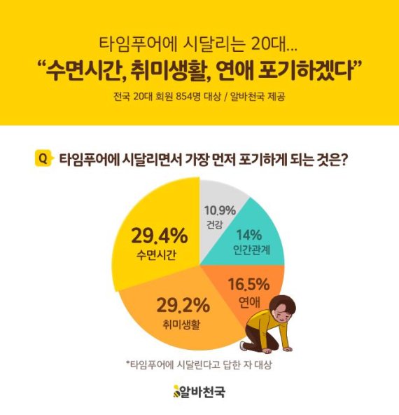 아르바이트 전문 포털 알바천국이 전국 20대 회원 854명을 대상으로 ‘타임푸어’’를 주제로 설문조사를 진행해 26일 발표했다.