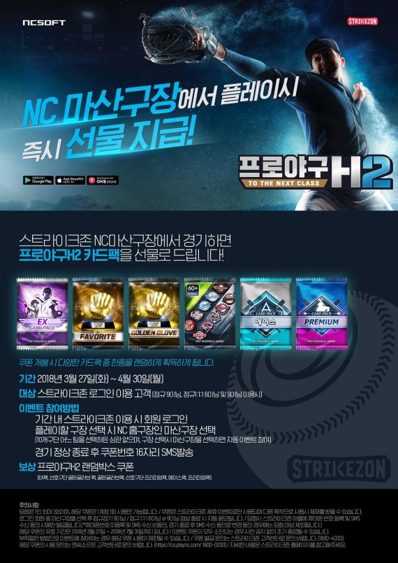 이벤트 참여 방법은 간단하다. 스트라이크존 이용 시 플레이할 구장을 NC 홈구장인 ‘마산구장’으로 선택하면 자동으로 이벤트에 참여할 수 있다. 경기 종료 시 발송되는 쿠폰을 H2 웹페이지를 통해 등록하면 EX팩, 골든글러브팩, 에이스팩, 프리미엄팩 등 다양한 H2 게임 아이템을 랜덤하게 받을 수 있다.