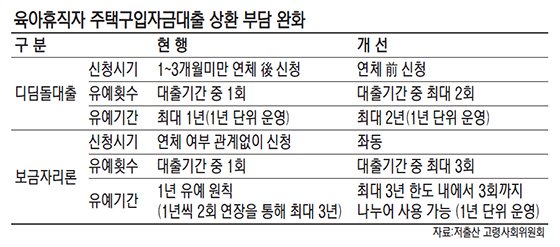 디딤돌대출을 받은 육아휴직자는 연체 여부와 상관없이 육아휴직 횟수에 따라 최대 2회, 총 2년 동안 원금상환을 유예받을 수 있게 된다. 저출산.고령사회위원회와 국토교통부, 금융위원회는 일하며 아이를 키우는 부모의 부담을 덜어주기 위해 이 같은 내용을 담은 제도개선을 추진한다고 27일 밝혔다. 디딤돌대출과 보금자리론은 무주택 신혼부부들이 주로 이용하는 저금리 정책자금 대출이다.