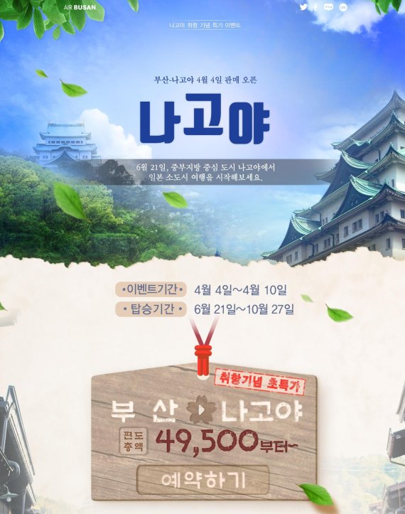 지역 항공사 에어부산이 오는 6월 21일 부산~나고야 노선에 매일 1회 신규 취항한다고 2일 밝혔다. 신규 취항에 앞서 오는 4일부터 취항 기념 특가 이벤트를 실시한다.