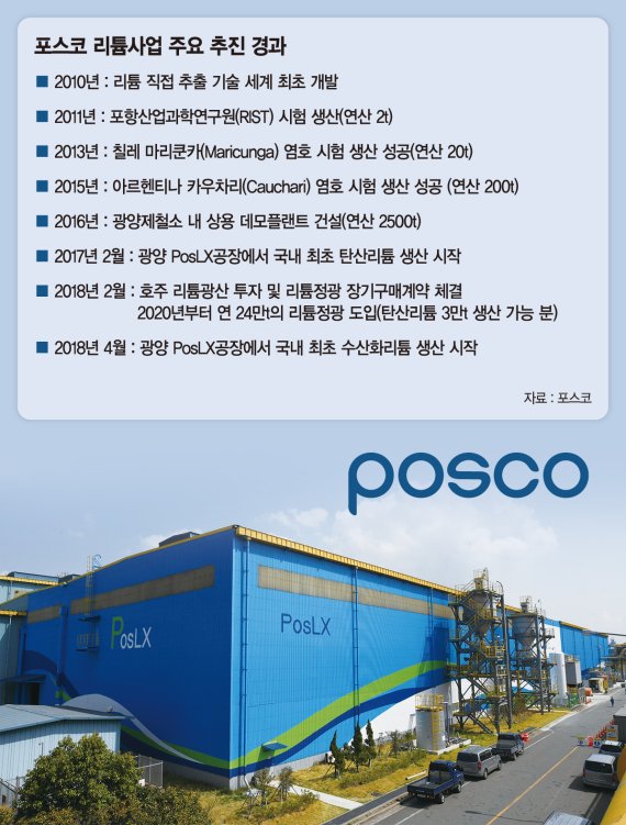 포스코는 2010년 리튬의 직접 추출기술을 세계 최초로 개발했으며 지난해 2월부터 광양제철소 PosLX 공장에서 탄산리튬을 생산하고 있다. 탄산리튬에 이어 1년여만에 수산화리튬까지 생산에 성공함으로써 두 제품을 병행 생산하는 연산 2500t(탄산리튬 1000t, 수산화리튬 1500t) 규모의 체제를 갖추게 됐다.