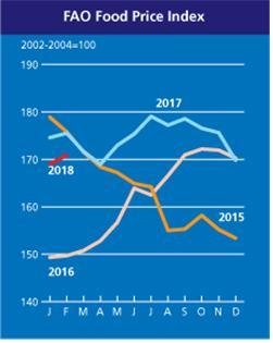 9일 유엔식량농업기구(FAO)에 따르면 지난 3월 세계식량가격지수는 전월(171.0)대비 1.1% 상승한 172.8포인트를 기록했다. 지난해 8월 이후 지난 1월까지 하락세였지만 지난달에 이어 2개월 연속 소폭 상승했다.