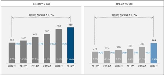 ㈜골프존(대표이사 박기원)이 마크로밀엠브레인과 함께 작년 11월 1일부터 12월 6일까지 제주도를 제외한 전국 15개 시·도 만 20세~69세의 성인 남녀 5000명의 표본을 추출해 조사한 결과(표본오차: 95% 신뢰구간의 1.4%p) 국내 골프 경험 인구는 모집단 3629만명 중 23%인 835만명으로 2016년 대비 35만명(+1.0%p)이 증가했다. 현재까지 골프를 꾸준히 즐기는 국내 골프인구 역시 약 469만명으로 전년 대비 82만명(+2.3%p) 상승했는데 이는 최근 6년 내 가장 높은 상승폭이다.