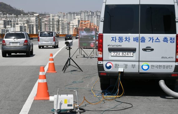 이날 서울 동호대교 남단 배출가스 단속현장에 설치된 스크린에 실시간으로 이동차량의 배출가스 상태가 안내되고 있다.
