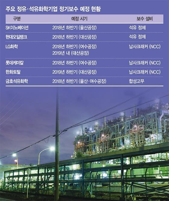 화학업계도 LG화학, 롯데케미칼, 한화토탈, 금호석유화학 등 대다수 기업들이 올 하반기부터 내년까지 납사크래커(NCC) 생산설비 등 주요 제품을 생산하는 공장들의 정기 보수 작업이 예정돼있다.