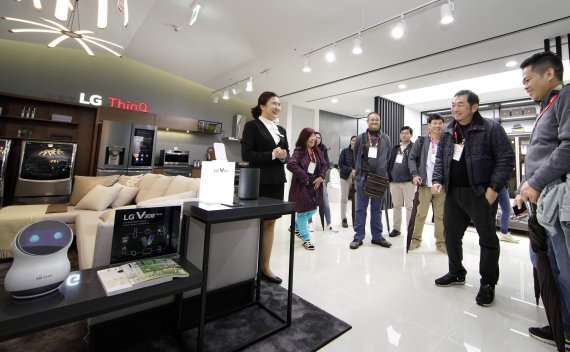 24일 아시아 지역 거래선 대표들이 인공지능 브랜드 'LG 씽큐'를 소개하는 전시 존에서 제품들을 체험하고 있다.