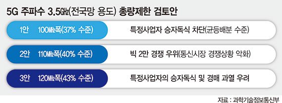 5세대(5G) 이동통신용 주파수 최저경쟁가격, 3조2760억원(3.5㎓대역 2조6544억원, 28㎓대역 6216억원)을 놓고 신경전이 가열되고 있다.