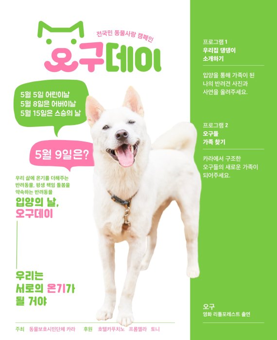 또한 오구데이에 시작되는 두번째 프로그램 ‘오구들 가족찾기’는 카라에서 그동안 구조한 백구들15마리에게 새로운 가족을 찾아주는 프로젝트이다. 우리 곁의 또다른 오구들의 입양을 활성화하기 위해 이런 프로젝트가 마련됐다. 5월 9일부터 가족을 기다리는 백구들이 소개될 예정이며 이번 오구데이를 통해 백구를 입양한 가족에게는 다양한 특전이 제공된다. 오구데이에 대한 자세한 참여방법 안내는 카라 홈페이지에서 확인할 수 있다.