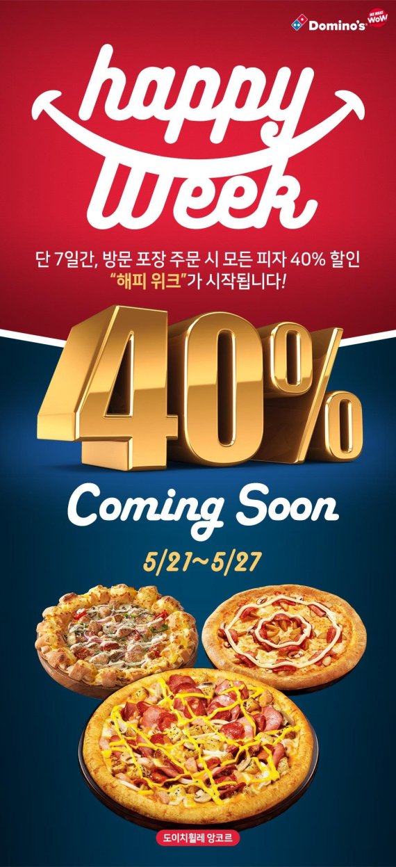 도미노피자는 오는 21일부터 27일까지 일주일간 전화·방문 및 온라인을 통해 포장 주문 시 피자를 40% 할인해주는 '해피위크 프로모션'을 진행한다고 18일 밝혔다.