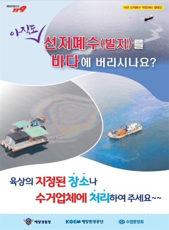 해양경찰과 합동 캠페인에 나서는 해양수산부와 해양환경공단에서는 10t미만 소형어선 대상 선저폐수 무상 수거를, 어업정보통신국에서는 선저폐수 육상 처리 관련 안내방송을 실시할 방침이다.