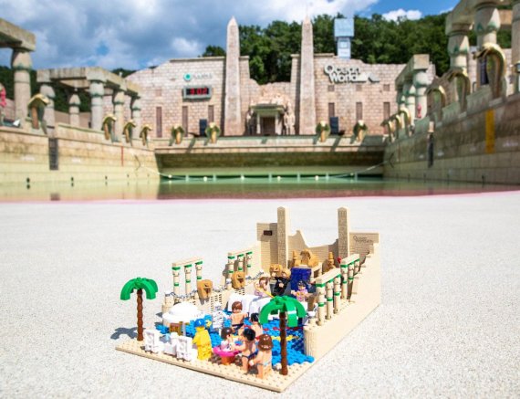 이번 블록 패키지는 비발디파크 한정판 첫 번째 블록 시리즈이다. 블록을 완성했을 시 크키가 가로 212 X 세로 320 X 높이 155mm 달하고 1023피스의 블록으로 이뤄져 있다. 이집트 테마의 웅장한 파도풀과 함께 물놀이를 즐기는 다양한 모습들이 디테일하게 재현됐다.