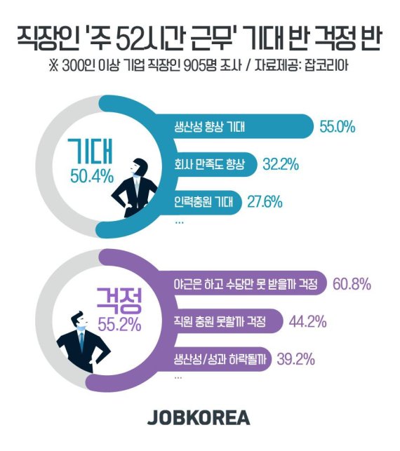 취업포털 잡코리아가 직원 수 300인 이상의 기업에 재직하는 직장인 905명을 대상으로 '주 52시간 근무제에 대한 인식'에 대해 설문조사를 실시한 결과를 발표했다..