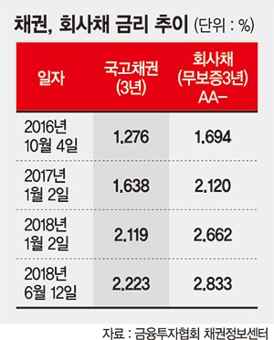 실제 상반기 채권 금리는 바쁘게 뛰었다. 지난 12일 3년 만기 국고채 금리는 2.223%로 연초(1월 2일 2.119%) 대비 0.104%포인트 올랐다. 연초 2.6%대 수준이던 3년 만기 회사채 금리(AA- 기준)도 2.8%대까지 뛰었다.