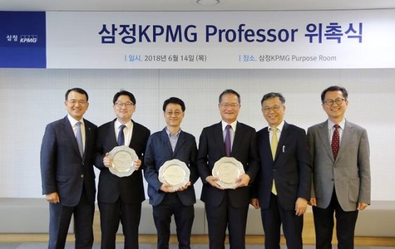 삼정KPMG는 지난 14일 서울 역삼동 본사에서 ‘2018 삼정KPMG 프로페서(Professor)’ 위촉식을 개최했다. 안태식 서울대 교수가 회계학 연구에 앞장선 공로로 '프랙티스 프론티어’에, 기업지배구조 개선 등을 위한 연구업적이 우수한 박종일 충북대 경영대학 교수는 ‘ACI 프로페서’에, 권세원 세종대 교수는 뛰어난 논문을 발표한 신진학자에 수여하는 ‘스칼라십 프로페서(Scholarship Professor)’에 각각 선정됐다. 김교태 삼정KPMG 회장, 권세원 교수, 박종일 교수, 안태식 교수, 양동훈 한국회계학회장, 조성표 경북대 교수(왼쪽부터)가 기념촬영을 하고 있다.