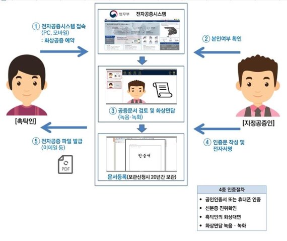 17일 법무부에 따르면 지난 2010년 전자공증 제도가 도입돼 전자문서 파일을 공증 받을 수 있는 시스템이 마련됐지만, 공증인법상 공증인이 동석하지 않으면 공증을 받을 수 없어 전자공증을 이용하더라도 공증사무소에 직접 출석해야 했다.