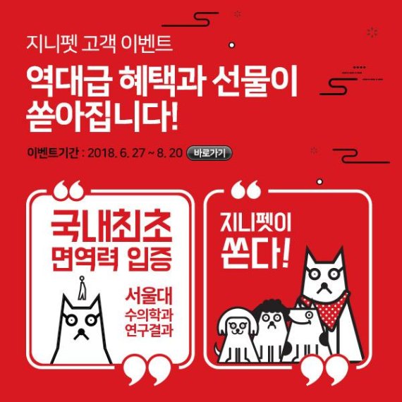 또한, 지니펫 홈페이지 회원 가입 시 ‘지니펫 면역키트’(지니펫 사료 50g*4개, 강아지 스카프)를 증정하며, 동시에 소매점에서는 사료 구매 시 200g을 추가 증정하고 스크래치 복권을 주는 이벤트를 진행할 예정이다.