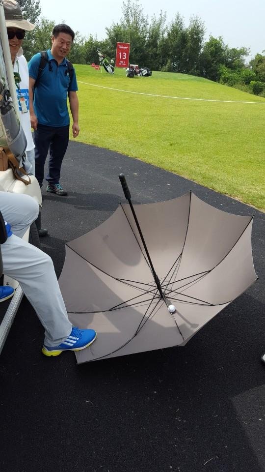 지난해 인천 드림파크CC에서 열렸던 티업.지스윙 메가오픈 때 있었던 일이다. 무전기로 다급하게 경기위원을 찾는 소리가 들렸다. 연락을 받고 도착해보니 좀 당황스러운 상황이 발생해 있었다. 한 갤러리가 카트 도로에 놓아둔 뒤집혀 있던 우산 안으로 플레이어의 볼이 들어간 것이다(사진). 이 경우 어떻게 보면 간단한 재정처럼 보이지만 실제는 그렇지 않다.