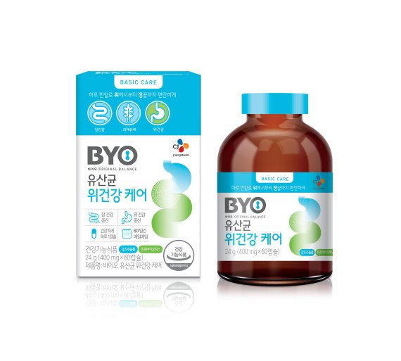 BYO 유산균 위건강 케어는 국내 기술로 개발돼 특허 받은 식물성 유산균 'CJLP243'과 위 건강 기능성이 있는 '감초추출물' 성분을 결합한 건강기능식품이다. 장 건강은 물론이고 위 점막 내 헬리코박터균 증식을 억제하고 위 점막을 보호해 위 건강에도 도움을 준다.