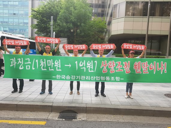한국승강기관리산업협동조합 회원사들은 행정안전부가 지난 5월 입법 예고한 '승강기시설 안전관리법 시행령·시행규칙 전부개정안'이 현실과 동떨어져 업계에 과징금 폭탄을 안길 우려가 있다며 이날 서울 광화문 정부서울청사 후문에서 '제8차 집회'를 열었다고 밝혔다.