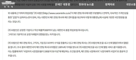 이에 헤드헌팅 업체들은 청와대 국민청원게시판에 청원을 올리며 집단적으로 반발하기 시작했다. 사람인 측은 "서비스 개편에 따라 상품이 조정된 것이지 가격을 터무니 없이 올린 것은 아니다"라며 "경쟁업체들도 있는 상황에서 갑질이라고 듣는 건 당황스럽다"고 해명하고 나섰다.